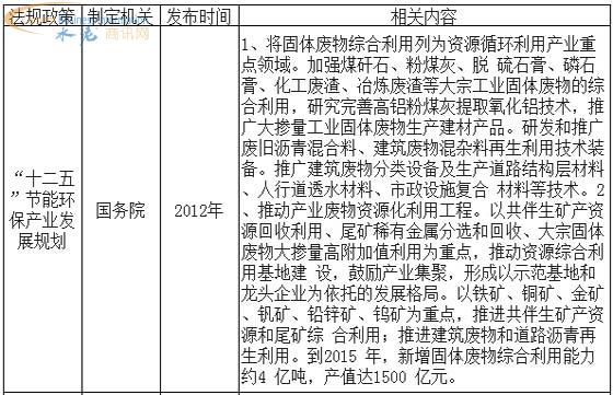 固体废弃物处理由于其行业具有公用事业性质,行业发展与国家政策密切相关。只有在相关政策的扶持下,固体废弃物处理行业的市场和收入才有所保障,行业才有可能高速发展。中国产业信息网发布的《2013-2017年中国固体废弃物处理设备市场研究及未来发展趋势报告》指出:从中国的相关政策来看,大方向是利于固体废弃物处理行业发展的,但有待于进一步完善,以促进固体废弃物处理行业更好更快的前进。