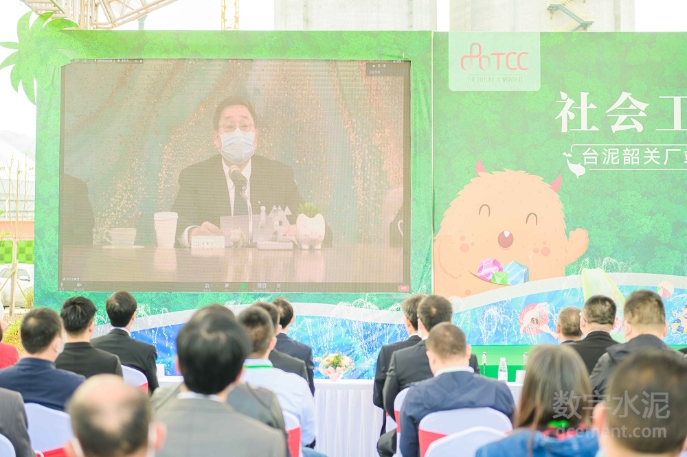 由于疫情关系,身在台北的台泥集团董事长张安平率领高管团队,通过视频连线向前来参加韶关厂典礼的领导嘉宾致谢。他表示:“水泥是一项取之于大地、用之于人类文明的事业。迈入75周年的台泥,从传统的水泥公司向全神贯注处理人类文明与大自然间复杂关系的绿色环境工程公司跨越。75年来,台泥的同仁们一直在坚持做应该做而且对社会值得做的事。韶关厂的落成为台泥的75周年庆献上最好的礼物,它将成为台泥在中国大陆的一家示范工厂,积极承担处置城市废弃物的责任,并肩负起推动工厂与社区共荣共绿发展的使命。”