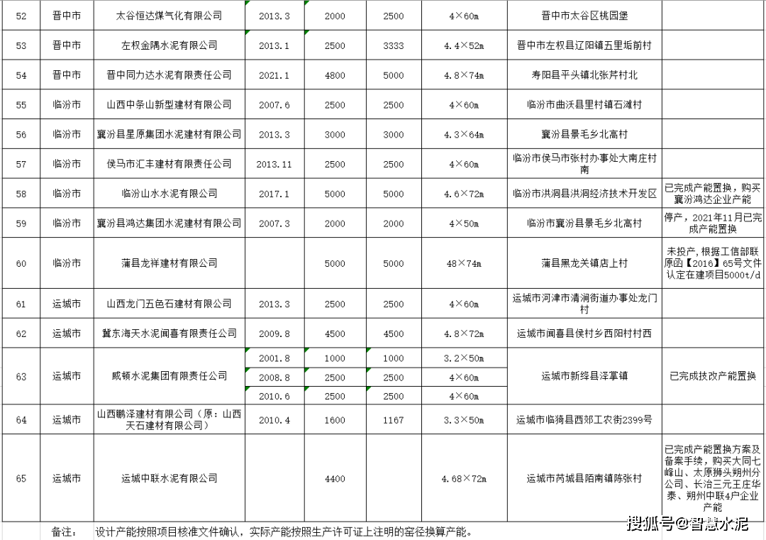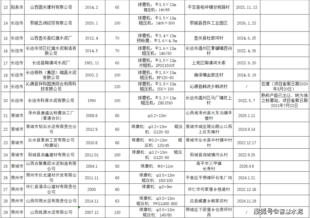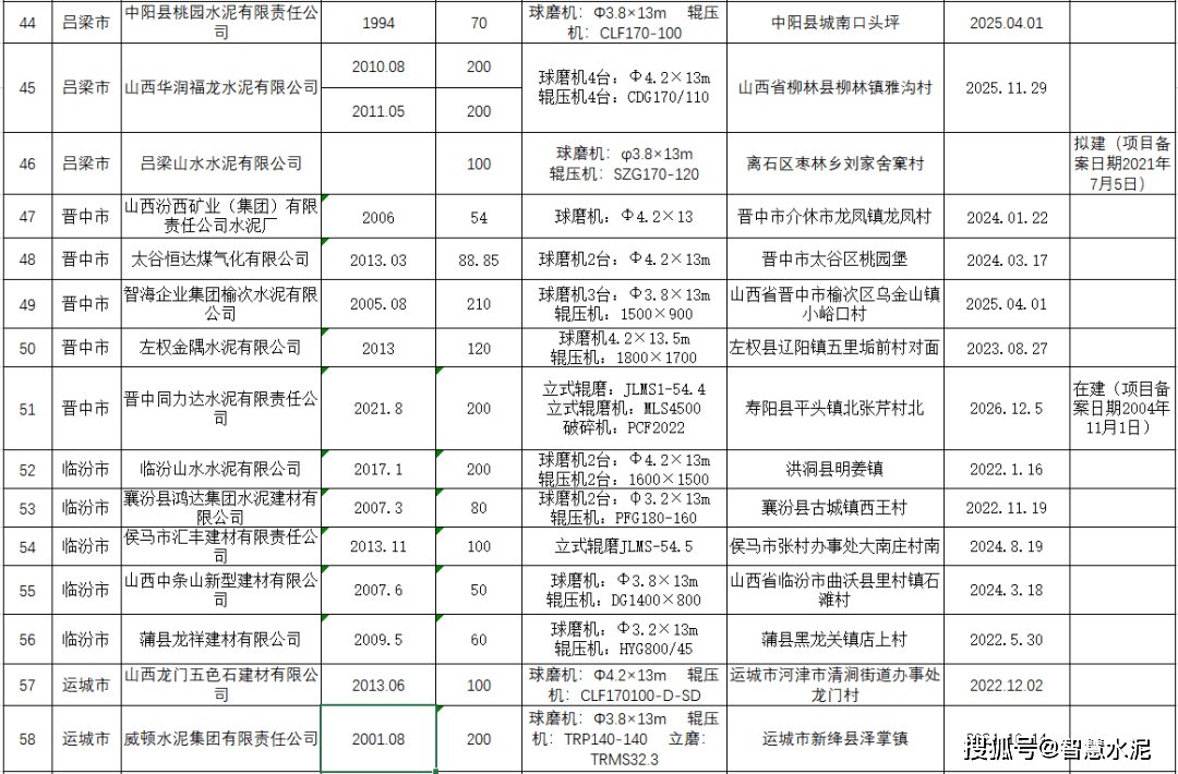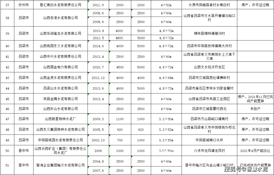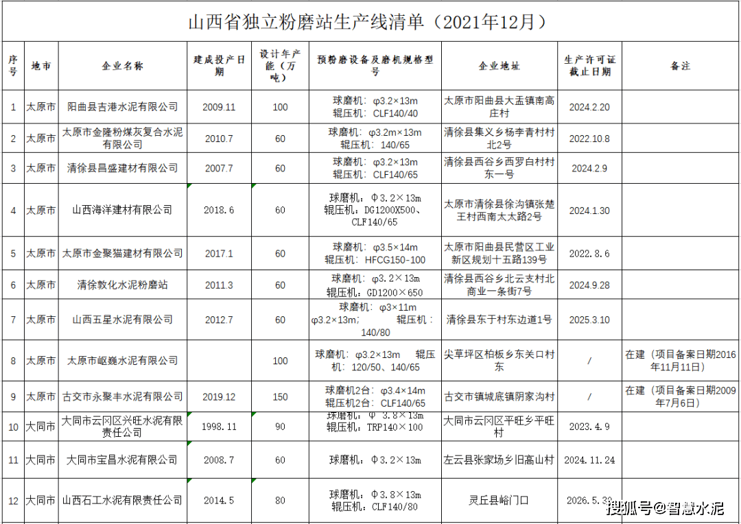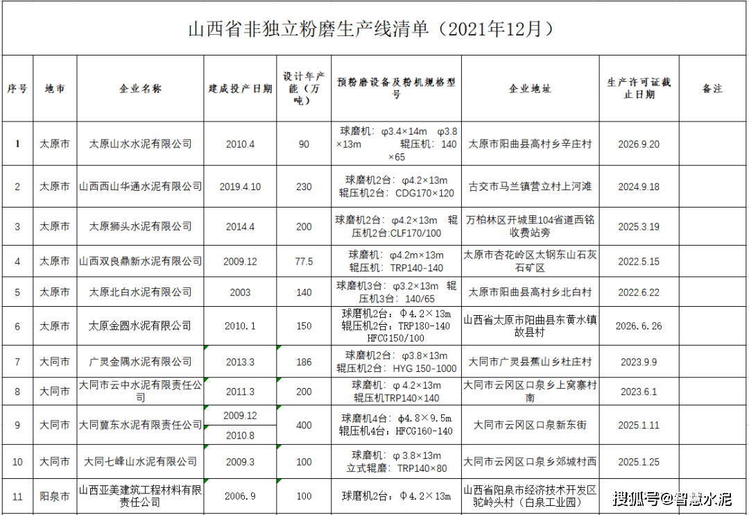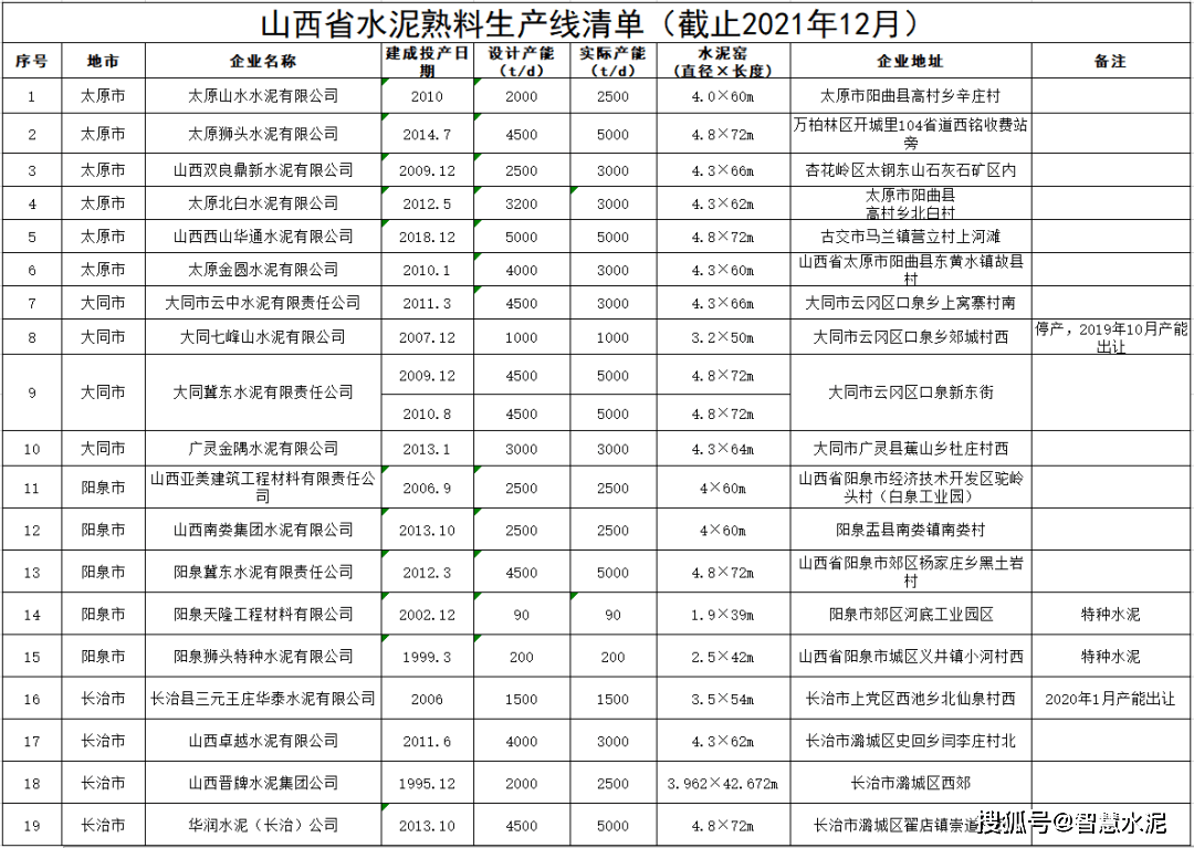 附:截至2021年12月31日山西省水泥熟料生产线和粉磨生产线清单