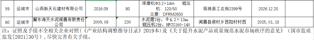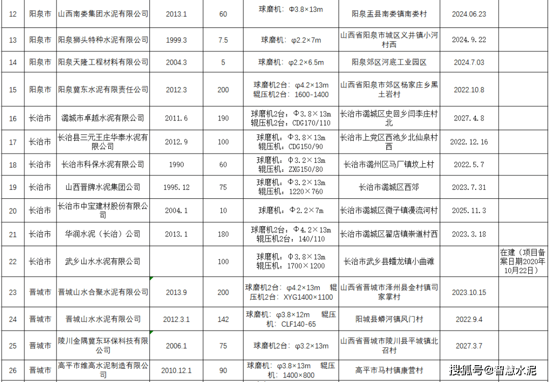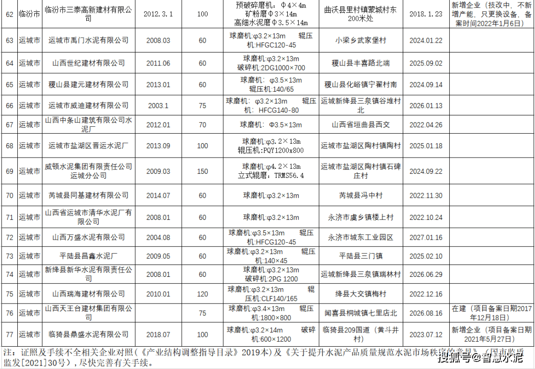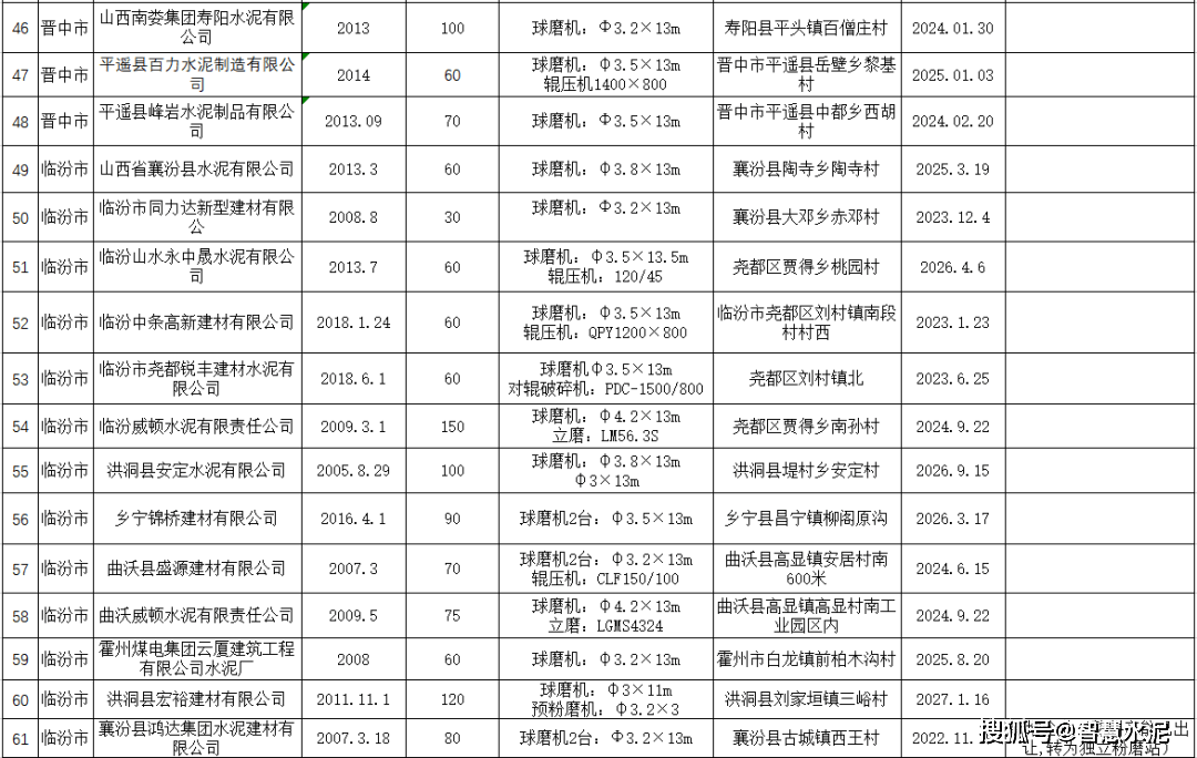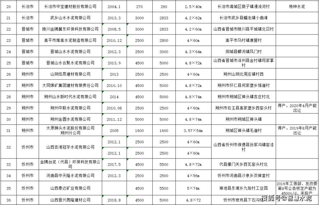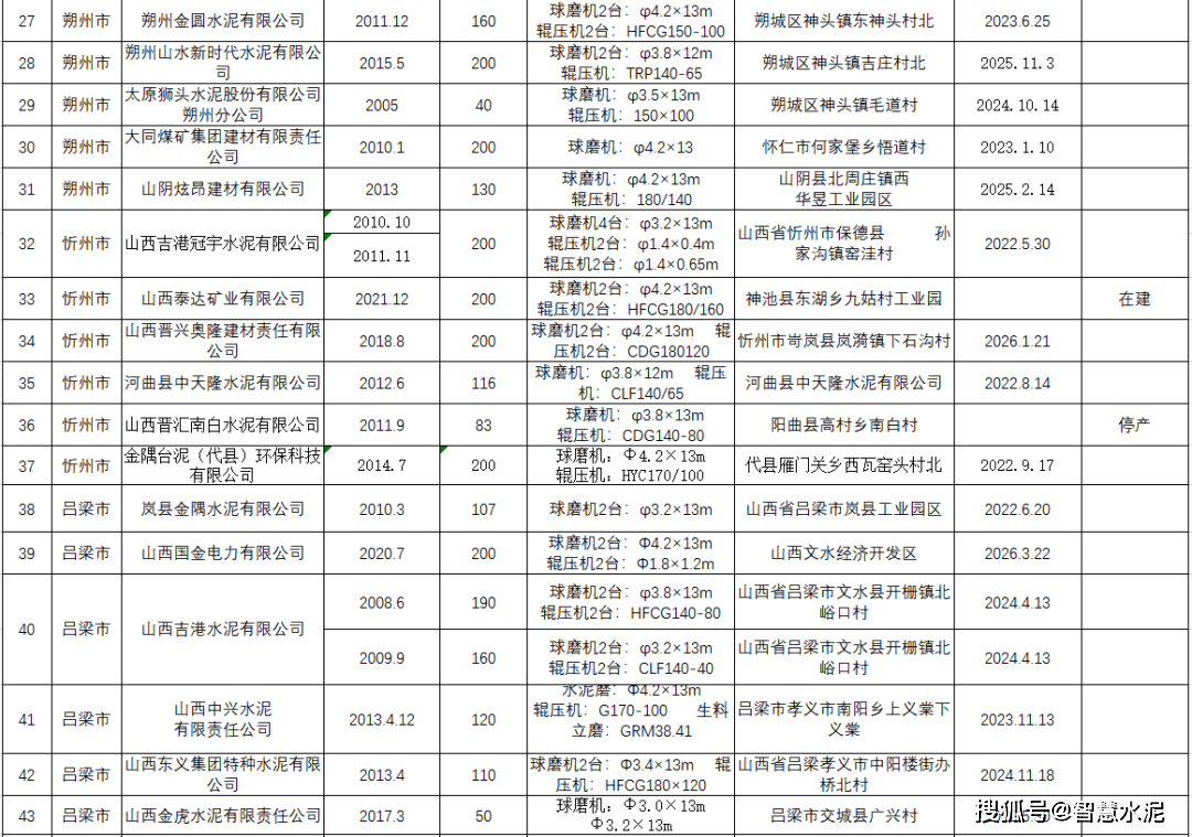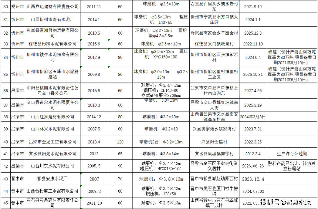 附:截至2021年12月31日山西省水泥熟料生产线和粉磨生产线清单