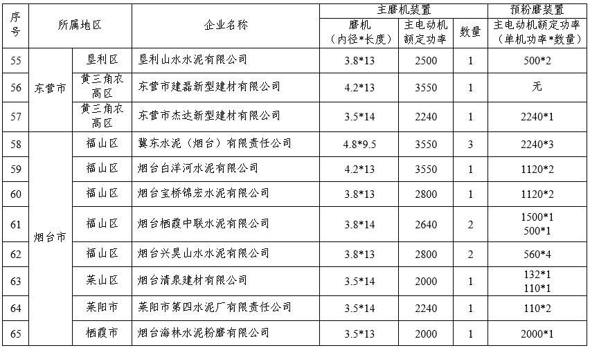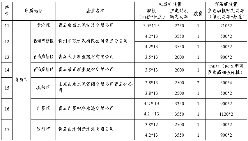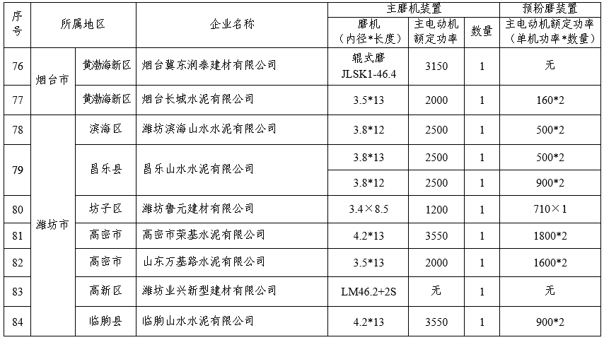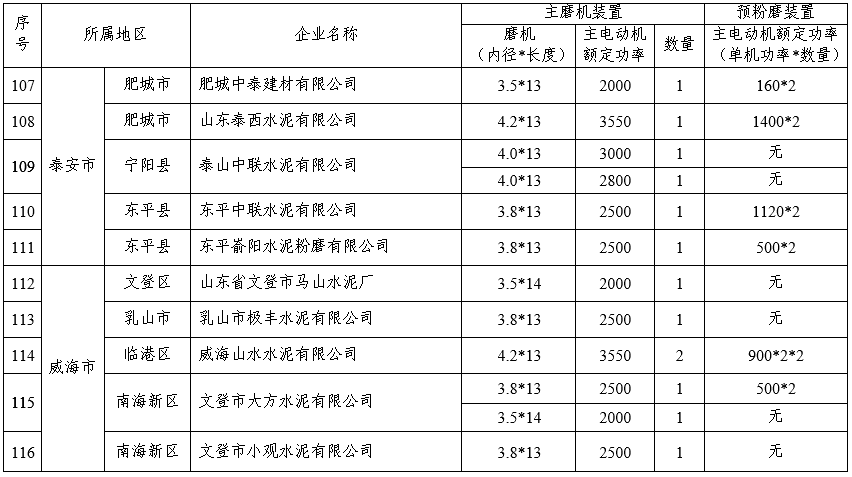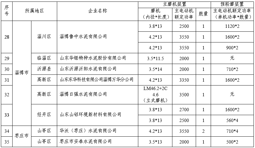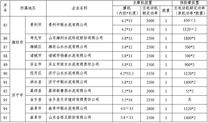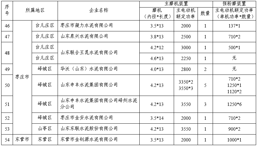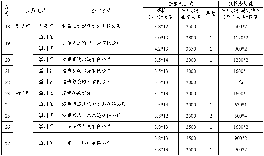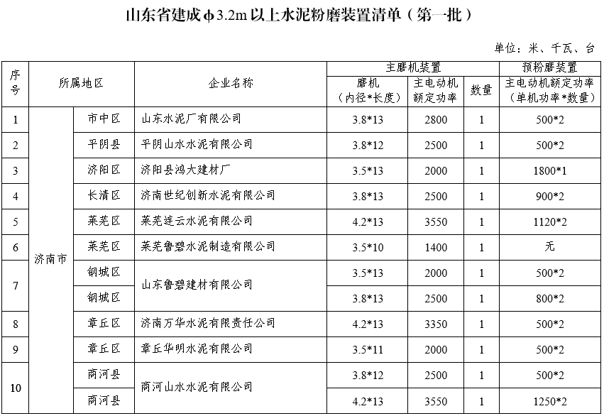 山东省建成φ3.2m以上水泥粉磨装置清单(第一批)