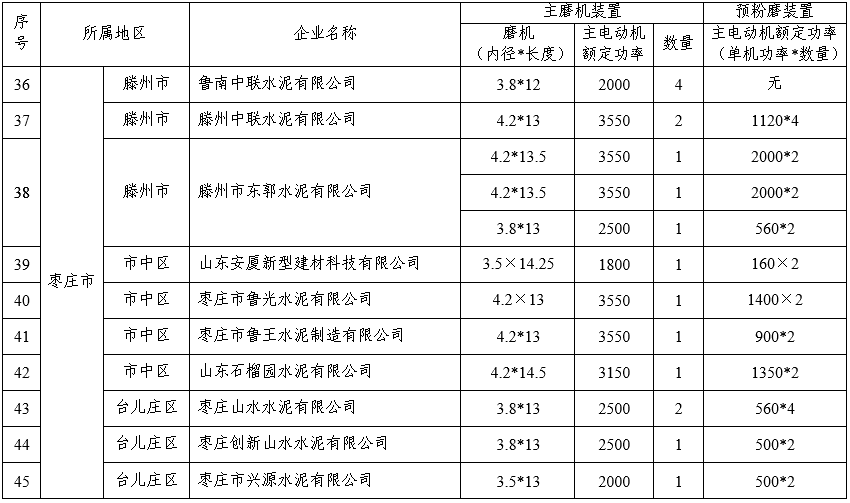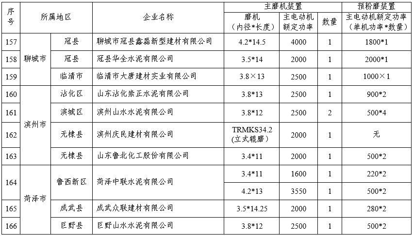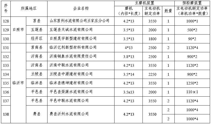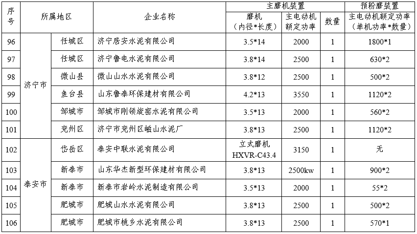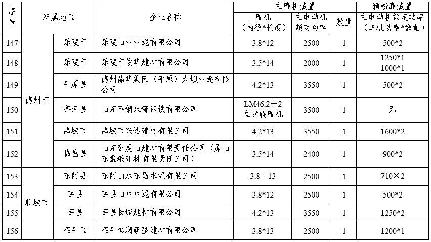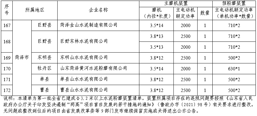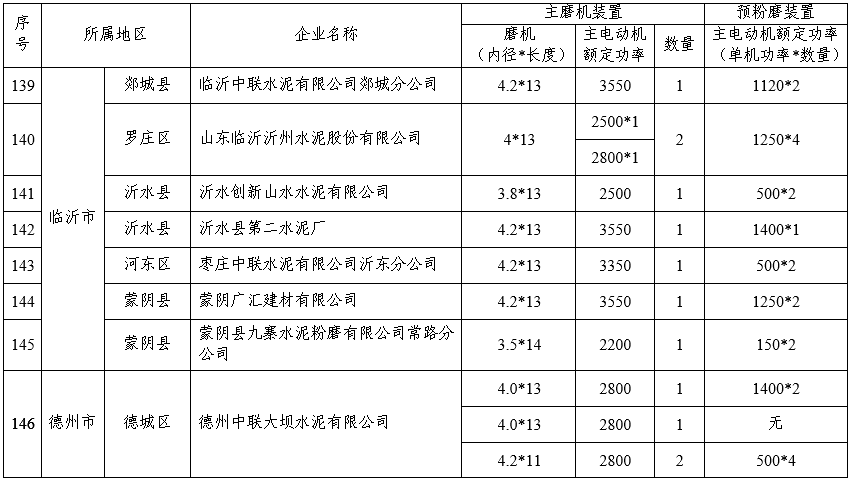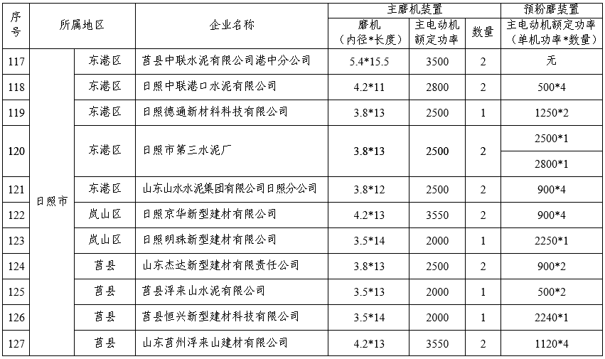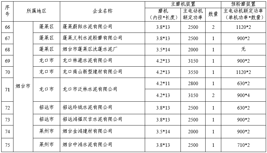 山东省建成φ3.2m以上水泥粉磨装置清单(第一批)